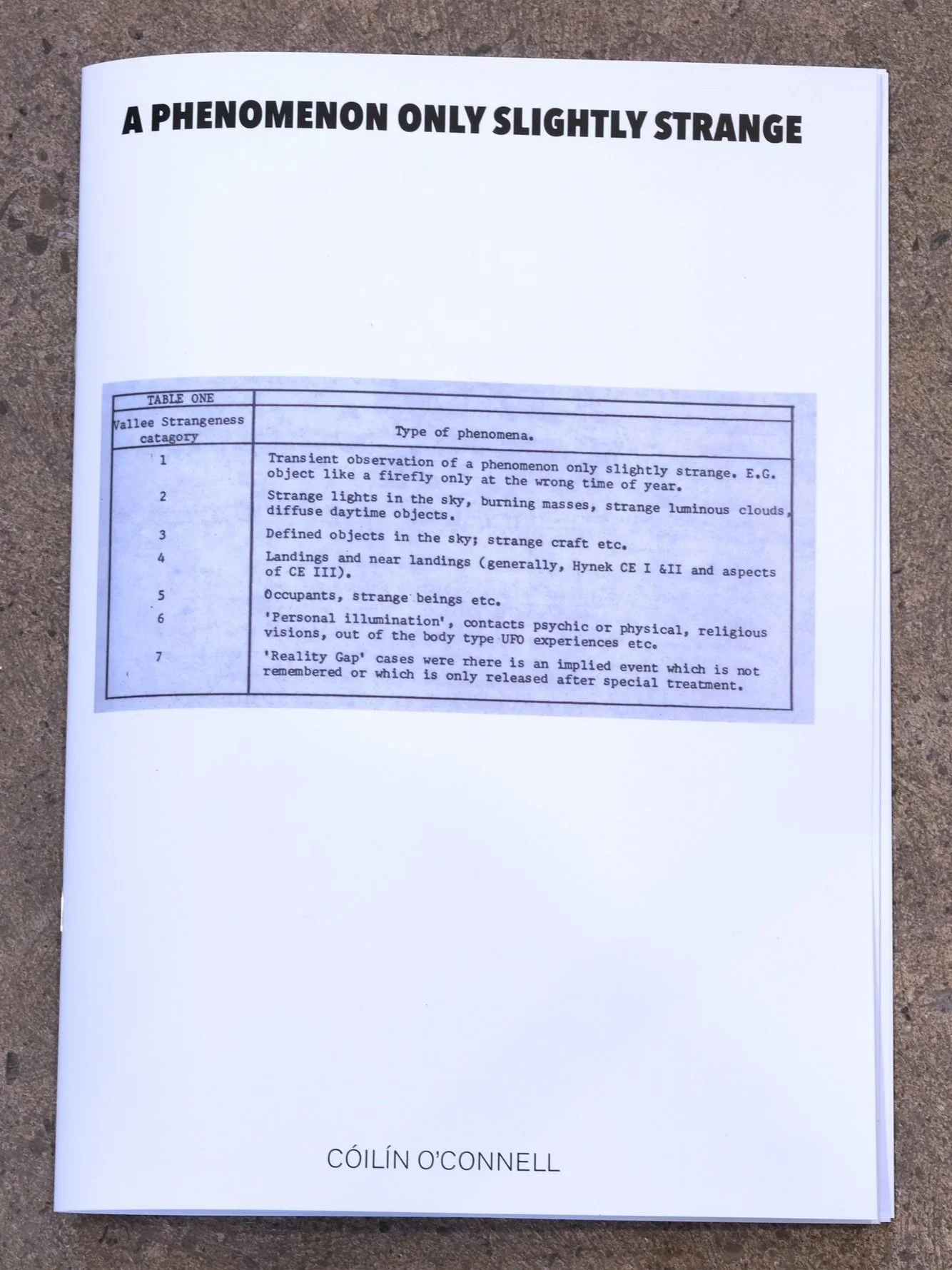 A Phenomenon Only Slightly Strange contains three texts that explore aspects of the UFO phenomenon as it relates to the peripheral and postcolonial states of Ireland and Cyprus. In this moment of an ending order and perceived collapse, the UFO does not manifest offering solutions to the periphery, but rather it undermines forgone conclusions. Proposing futures that never arrived, pasts that are suppressed and challenging agreed upon truths.